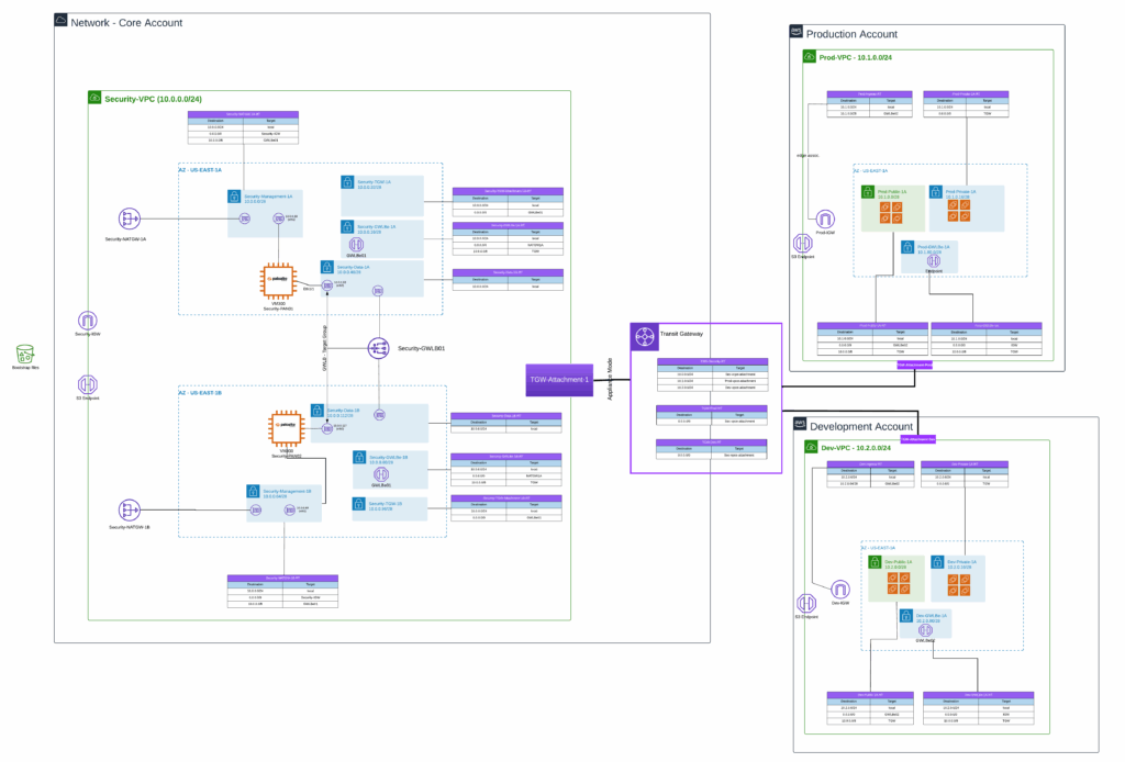 The setup requires the use of Resource Access Manager (RAM) to share the Transit Gateway across the accounts. The TGW needs to be set to “appliance mode” and we also learned that the transit_gateway_default_route_table_association and transit_gateway_default_route_table_propagation need to be set to “false” (default behavior is “true”). This then requires your code to setup the needed route tables, route table associations and the routes. The strange thing is, we could never figure out was why Terraform could not add the routes we needed. Our work around was to use a null_resource and have a local-exec call the AWS cli to add the route. We run the local-exec for each route needed passing the params needed at run time. Like the following: