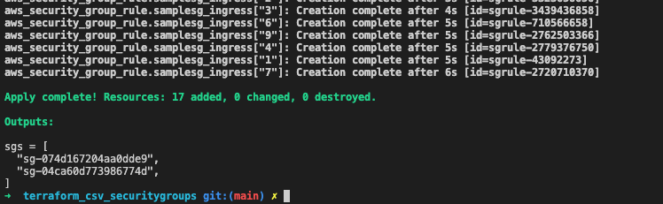The above CSV is passed to the TF code and results in creating two Security Groups – “security-group-1” with 9 rules and “security-group-2” with 4 rules. The first column is used by the TF code to determine the each rule by id (sudo index).
